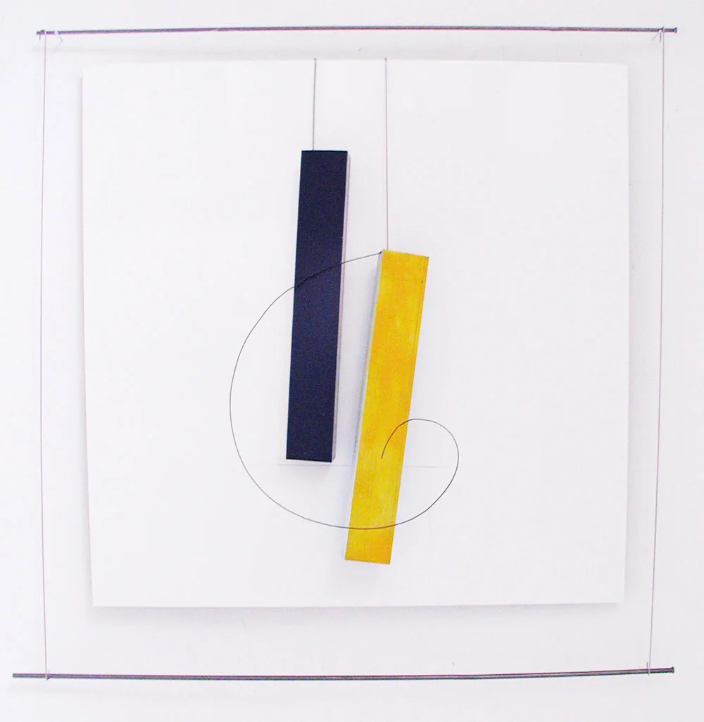“In the piece titled “Yellow Seas”, Rodgers uses primary colors , yellow and blue, on overlaid aluminum sheets and brushed through to produce a striking work that floats and curves the surface as you watch it.”